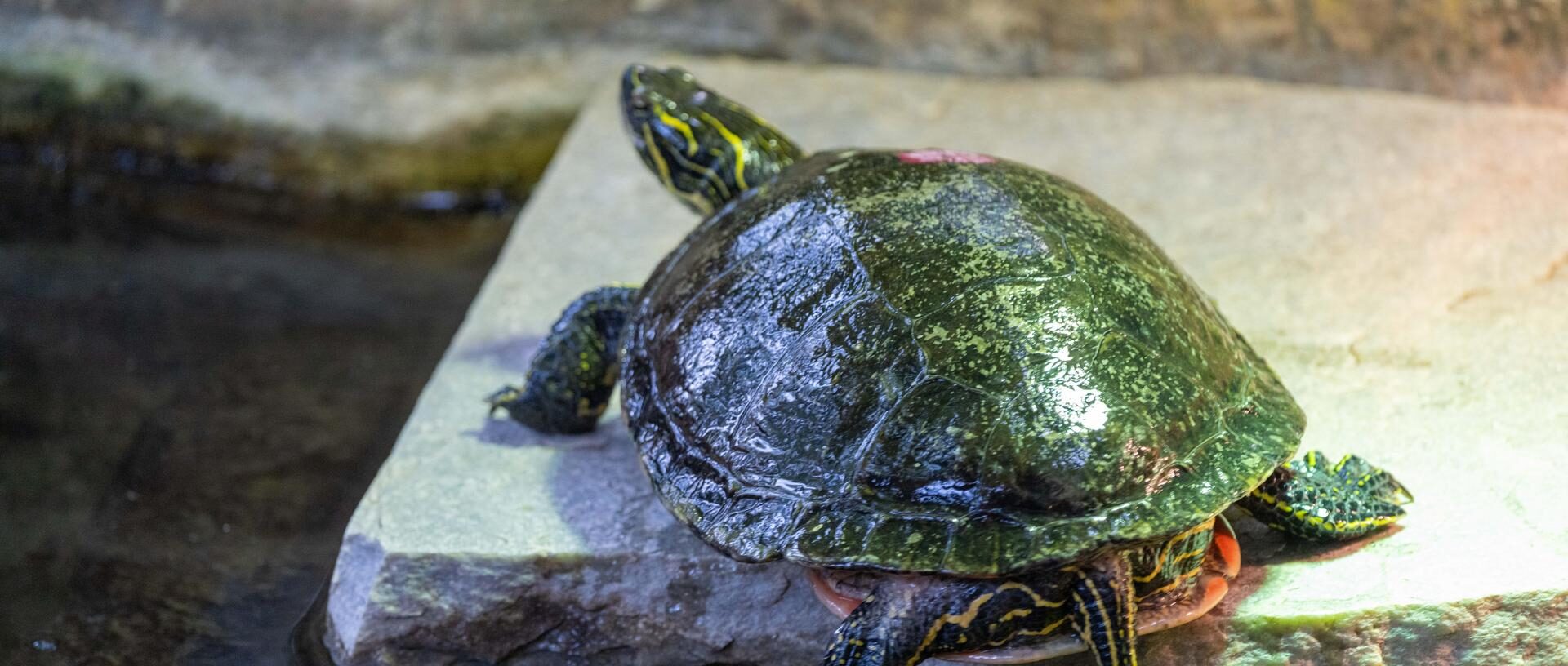 The western painted turtle is the largest subspecies of painted turtle, with a shell that can be 10 inches long. Identified by the red and orange stripes on their shell and body, and yellow stripes on the head and neck, these turtles make their homes in slow-moving water with soft, muddy bottoms and vegetation, such as marshes, ponds, creeks, and lakes. In the wild, they overwinter in bodies of water, but here at the zoo, they spend the colder months in our Administration building.